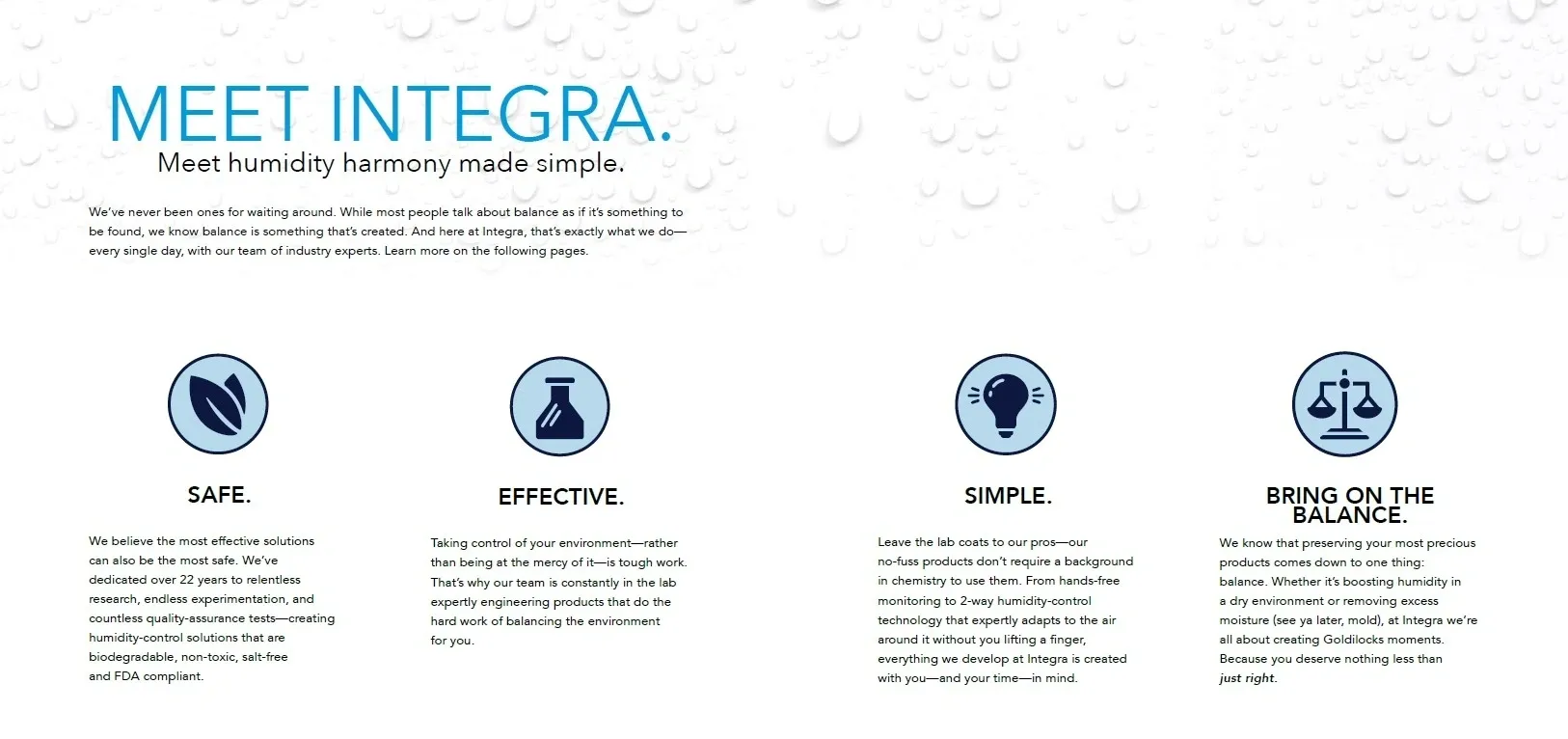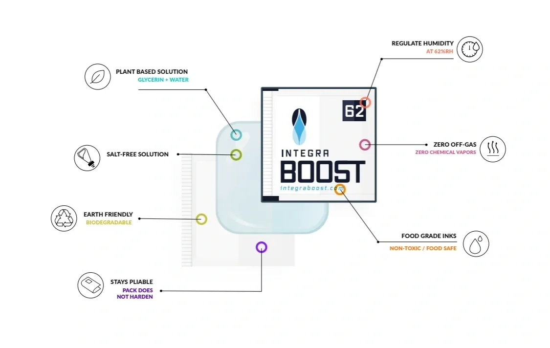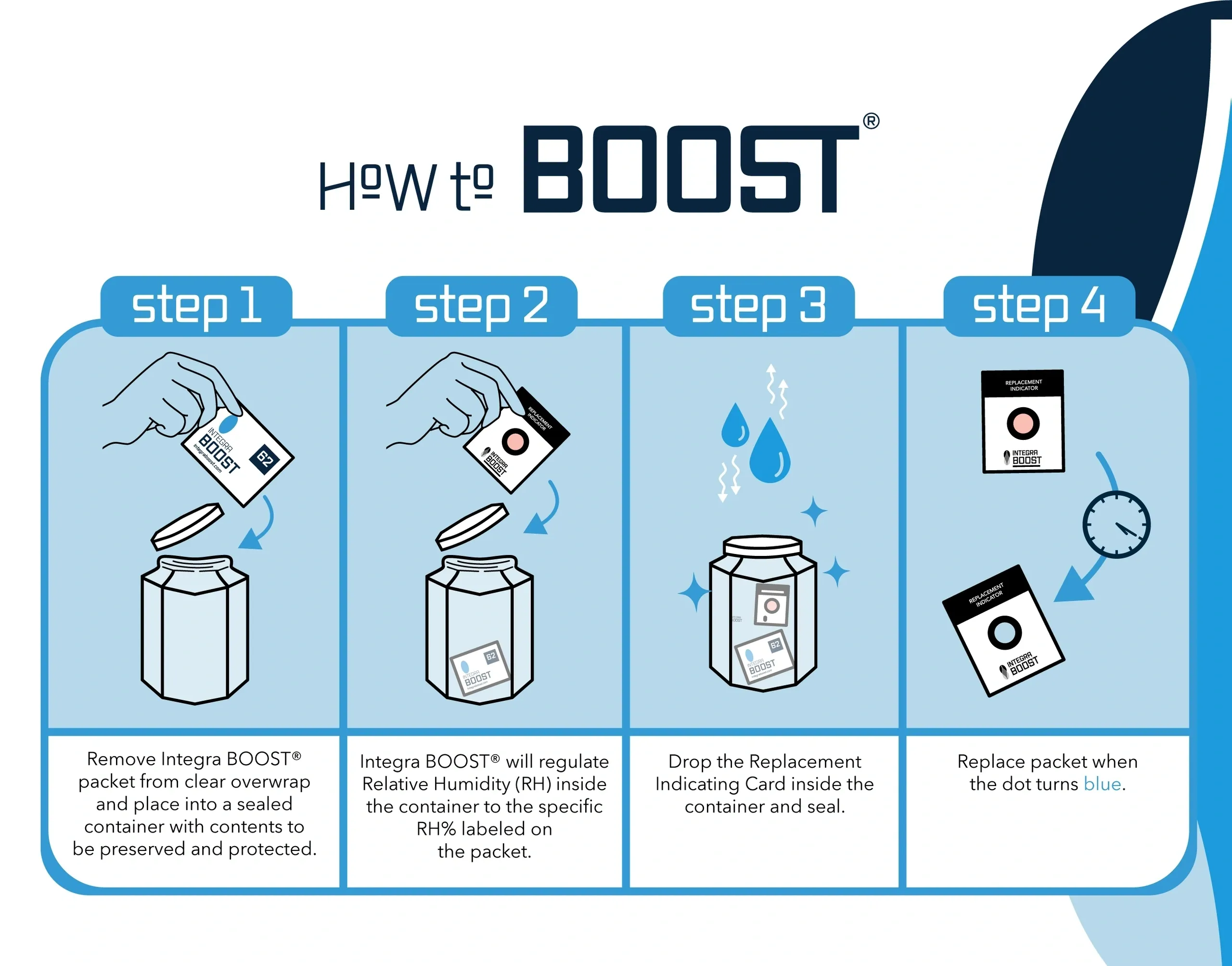 Eliminate the Guessing Game INTEGRA BOOST 2 way humidiccant uses patent pending technology that releases or absorbs moisture, maintaining RH at 62% in a contained environment, with zero off gas.